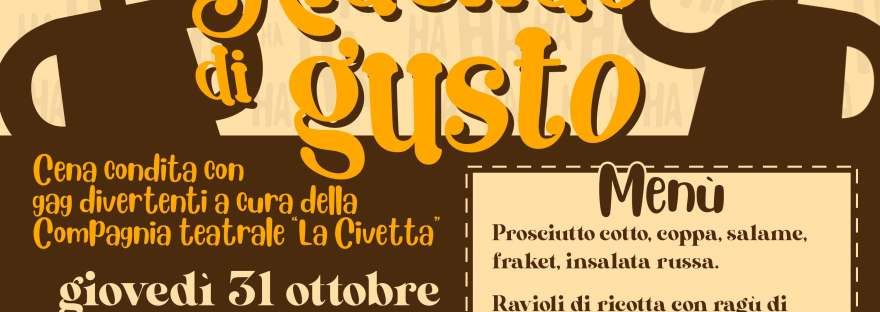 Dopo il successo della Cena con Delitto del 2021, la Compagnia Teatrale della Civetta torna al Castello/Monastero di Lenta (VC), in via Santa Marta 5. Ridendo di Gusto è la serata in cui, in una location ricca di storia, potrete assaporare un'ottima cena "condita" con gag divertenti a cura della Compagnia. Menù prosciutto cotto, coppa… Continua a leggere Ridere e mangiare di gusto!